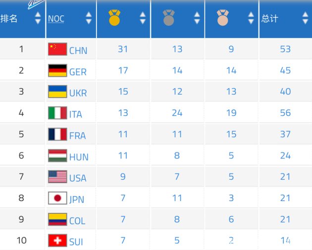 在第9个比赛日的奖牌榜上,意大利以50枚奖牌不息高居第一、中国队与德国队王人是43枚奖牌排在第二和第三位,乌克兰队则以35枚奖牌位居第四,法国队以34枚奖牌位居第五位,好意思国队的奖牌总额为15枚。