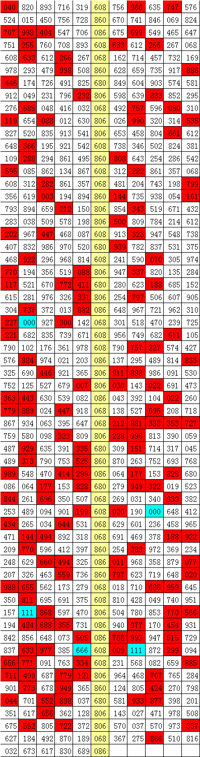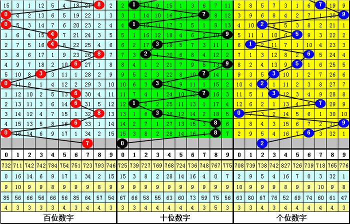 在以上统计表中,组选号码068开出之后,其下期组三号码出现14次,组六号码出现45次。其中,下期奖号有17期无重号,有42期开出重号,本期预测重号开出,看好开出组六号码。