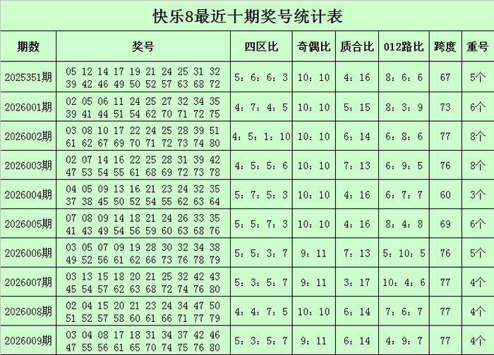 福彩快意8第2026009期开奖追念:03 04 08 17 18 31 34 37 42 46 47 55 56 61 65 70 74 75 76 80,其中奖号四区比为5:3:5:7,奇偶比为9:11,质合比为6:14,跨度为77,012路比为4:9:7,开出4个重号:04、34、47、61。